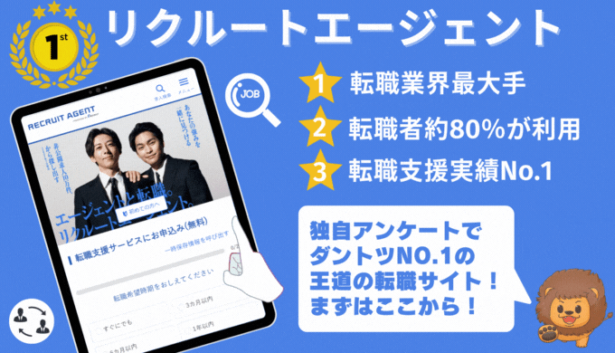 他の転職希望者に出遅れないように、まずは王道のリクルートエージェントに登録してから転職活動をはじめましょう。